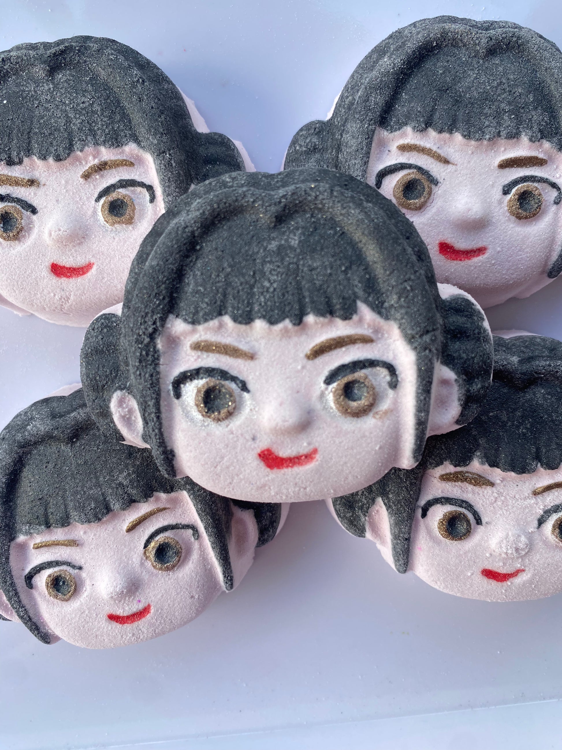 Ingredients: baking soda, citric acid, magnesium sulphate (epsom salt), kaolin clay, organic coconut oil, polysorbate 80, essential and/or fragrance oils, water soluble dye/mica, biodegradable glitter/sugar/botanicals as applicable.
